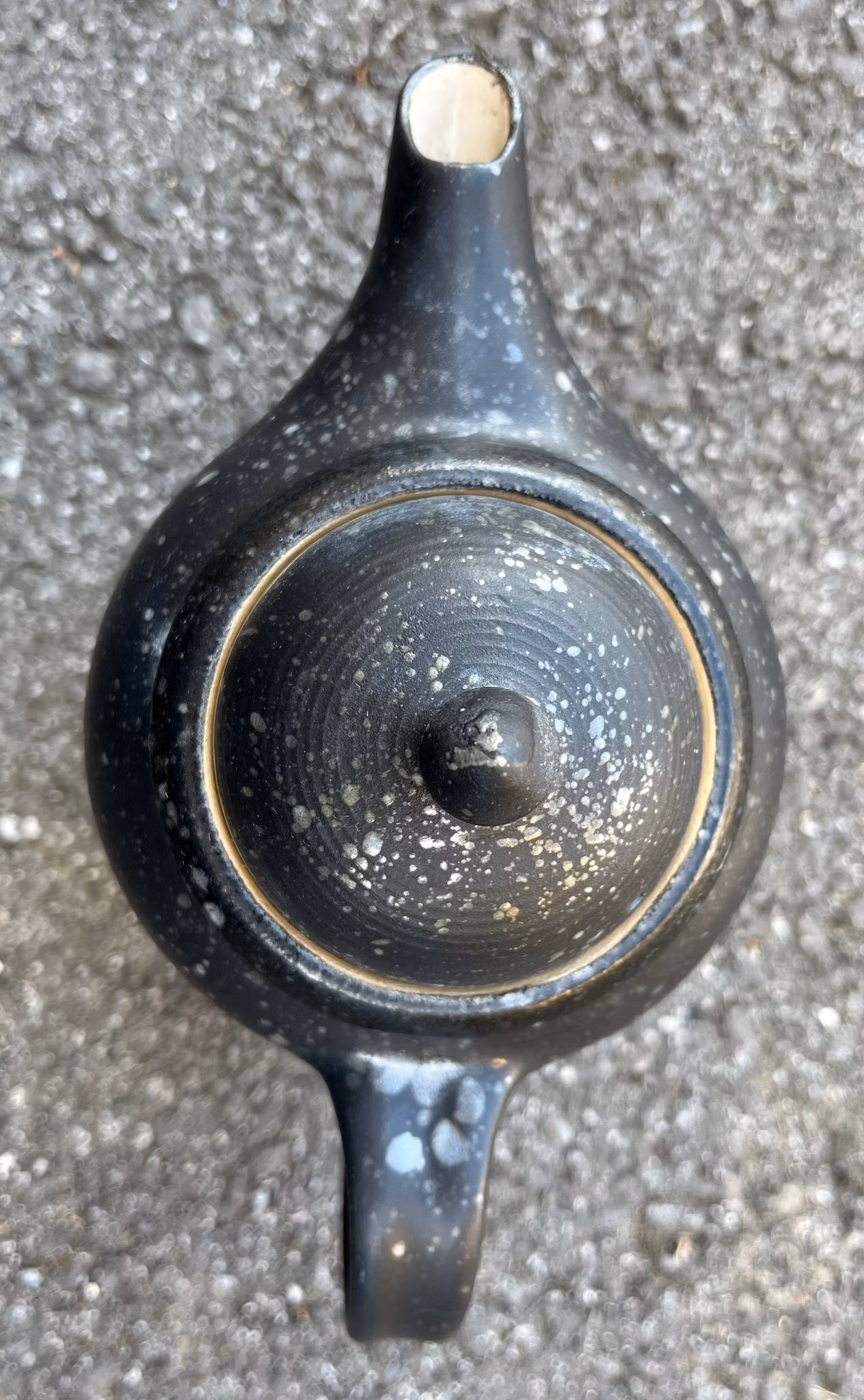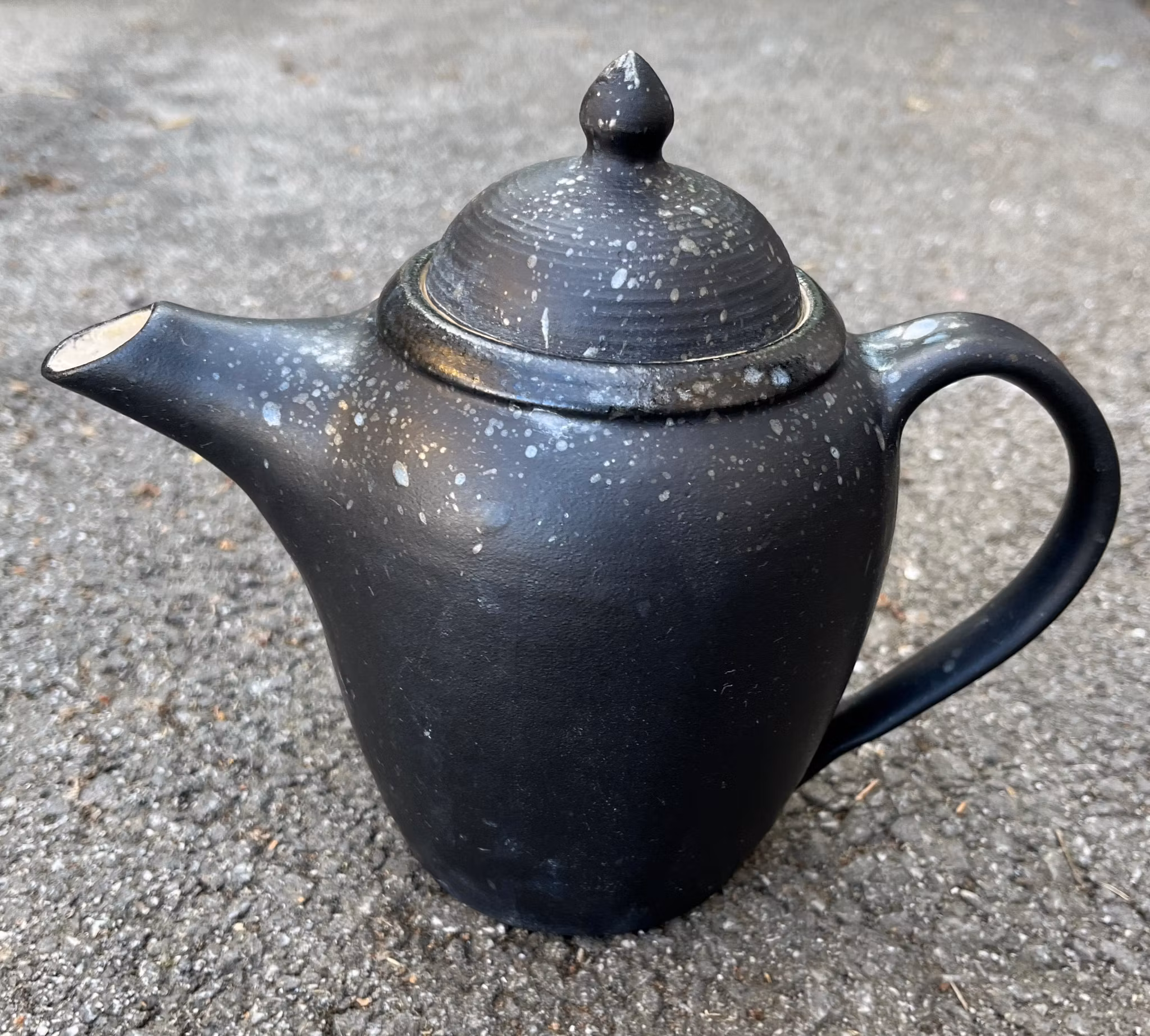 Tekanna i svart matt glasyr och silverstänk. Insidan är blankt transparent med små blå stänk. Höjd ca 17 cm, Vidd ca 20,5 med handtag. Rymmer ca 6 dl och väger ca 830 gram utan vätska.